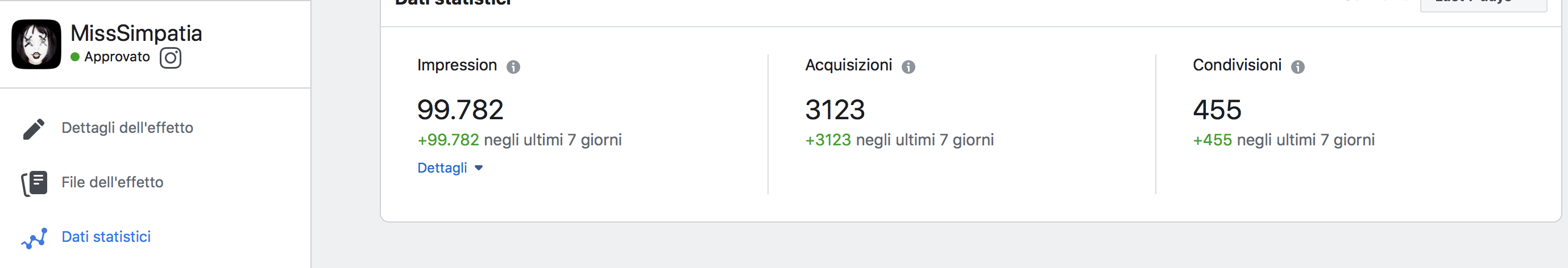 Vi lascio i dati statistici di quello che il mio filtro è riuscito a fare in sole 24 ore Un aumento di quasi 100.000 in impressione nel giro di 7 giorni, tradotto in termini di seguito sono cresciuta di circa 3000 followers, non ho nemmeno pubblicizzato più di tanto la notizia del mio filtro ai miei followers, direi che in un momento come questo dove è sempre più difficile crescere sui social (tranne rare eccezioni) i filtri Instagram ci danno una gran mano!